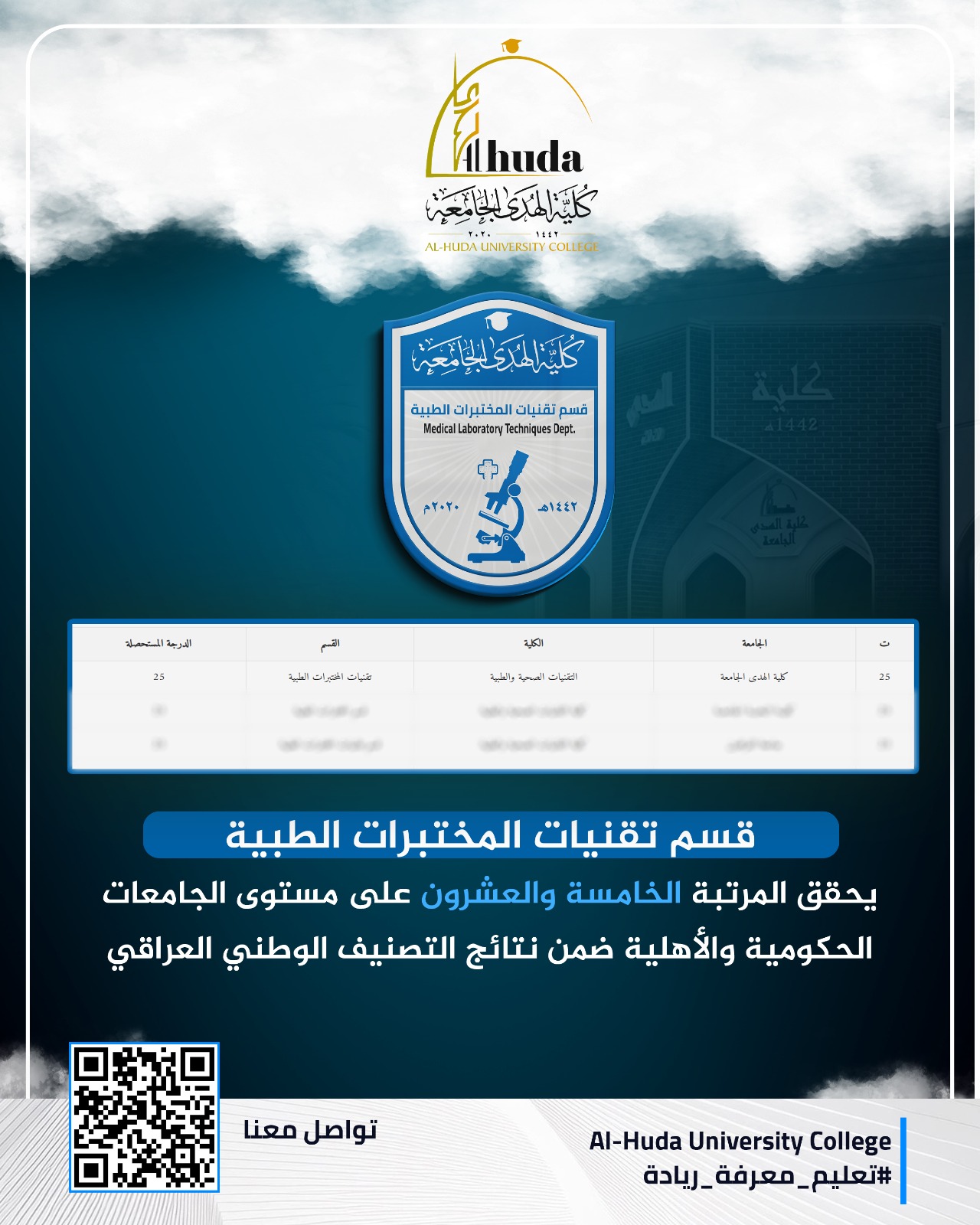 إنجاز جديد يُضاف إلى سجل النجاحات الأكاديمية لكلية الهدى الجامعة إذ يواصل قسم تقنيات المختبرات الطبية مسيرته المتميزة بتحقيق المرتبة الخامسة والعشرون على مستوى الجامعات الحكومية والأهلية، وفق نتائج التصنيف الوطني العراقي.