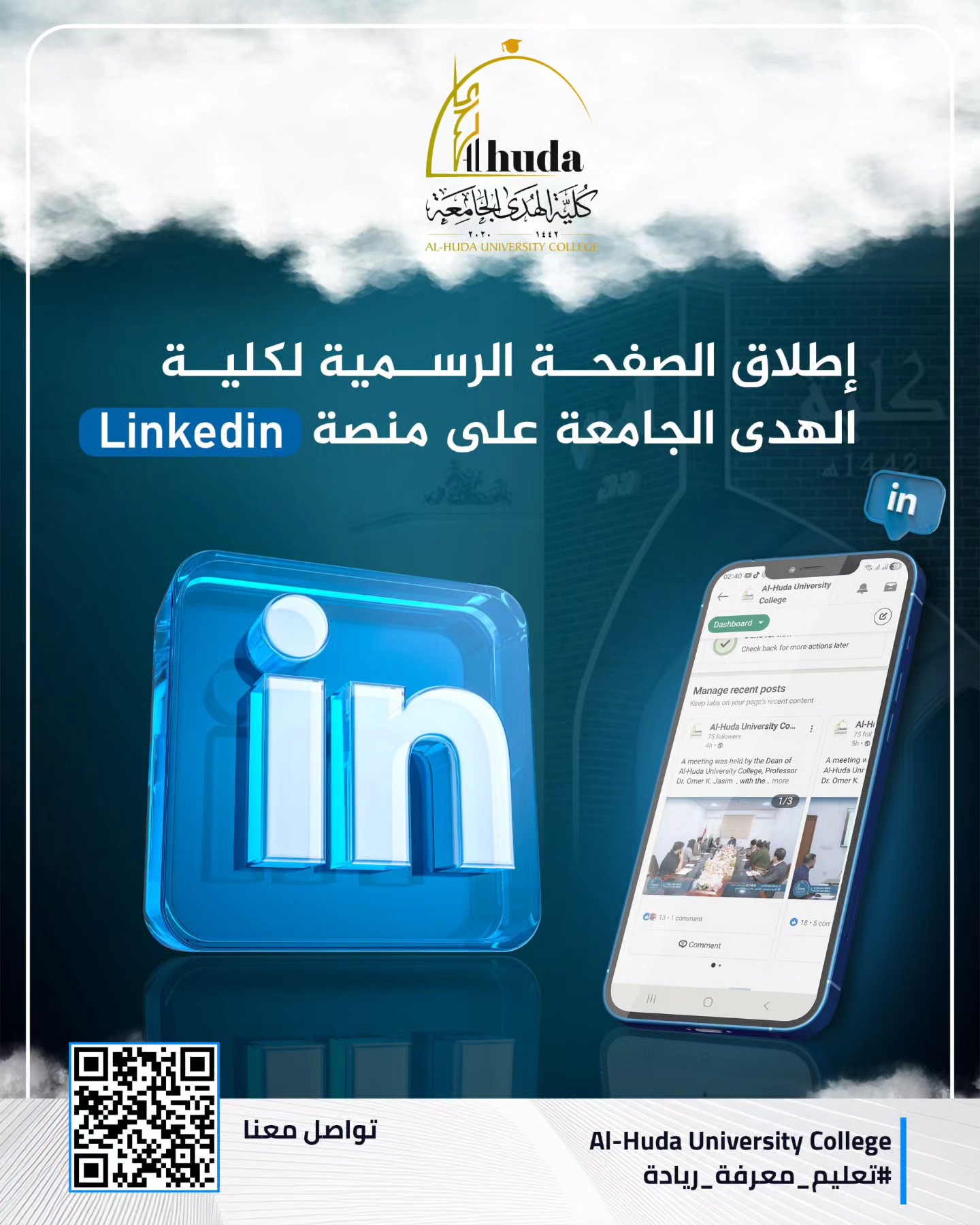 Al-Huda University College is pleased to announce the launch of its official page on LinkedIn, with the aim of strengthening its academic and professional presence and enhancing communication with our dear students, alumni, and all those interested in the field of education.