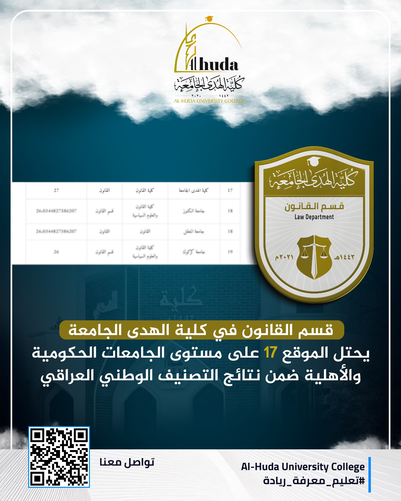 The Department of Law at Al-Huda University College continues to realize distinguished academic achievements, having secured seventeenth place nationwide among public and private universities, according to the results of the Iraqi National Ranking.
